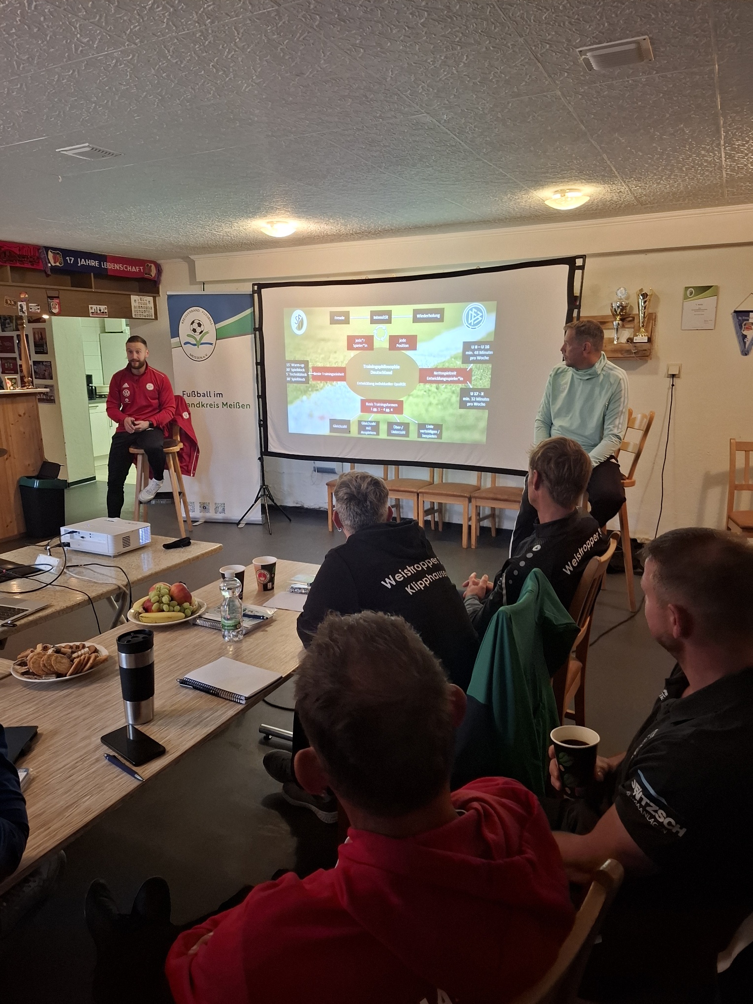 Nach der absolvierten ersten online-Phase trafen sich die Trainerin und Trainer am Wochenende 06./07. September in Zeithain zu den ersten beiden Präsenztagen. Beim durch den KVF Meißen angebotenem Lehrgang erhalten alle, teils aufbauend auf das DFB-Kinderzertifikat, umfassende weitere Grundkenntnisse für die Trainings- und Spielgestaltung aller Altersklassen, sowie Hintergründe für Individual- und Gruppentaktik.