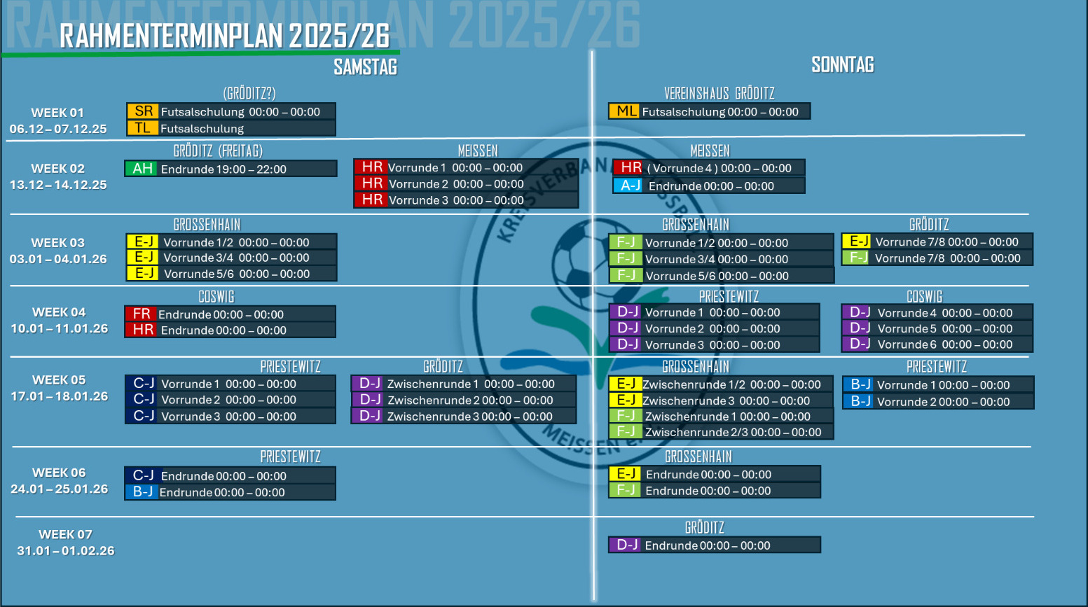 hier erhaltet Ihr ebenfalls nochmals die Ausschreibungen, sowie den Rahmenterminplan für die Hallenkreismeisterschaft 25/26. Dieser ist der aktuelle Entwurf und wird je nach Anmeldungen abweichen.